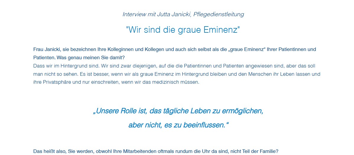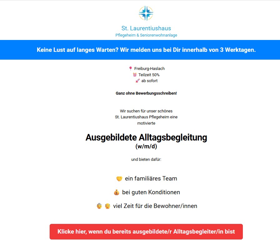 Ziel war daher, nicht nur die Vorteile, sondern auch mögliche Herausforderungen offen zu kommunizieren, um Fehlbesetzungen zu vermeiden. Dafür führte ich ein ausführliches Interview mit der Pflegedienstleiterin, das auf der neuen Website veröffentlicht und in Google Ads eingebunden wurde. Zudem richtete ich Anzeigen gezielt an Pflegekräfte, die über einen Ausstieg wegen Stress nachdenken, ohne aktiv auf Jobsuche zu sein.